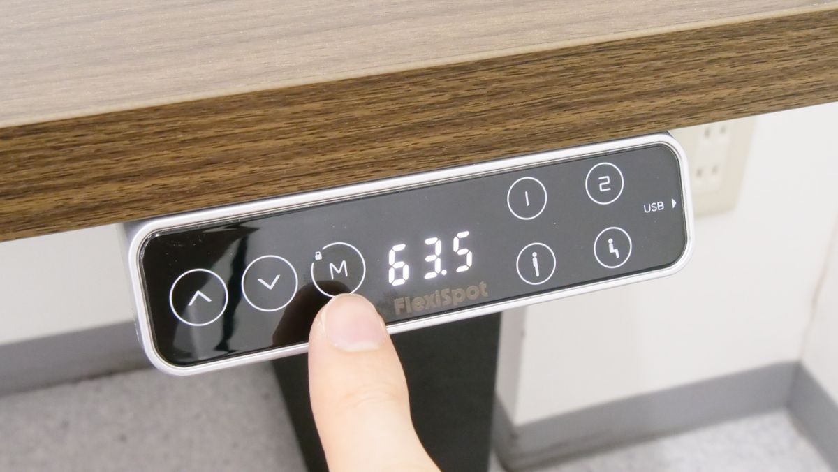 適当なボタンを押してみると液晶が点灯し、現在の机の高さが表示されました。なお、表示されている単位は「cm」で、数値は天板上部の高さを指していました。コントローラー左側の「上ボタン」「下ボタン」を押し続けると、デスクを昇降させることができます。デスクが一番低い状態は「63.5cm」。