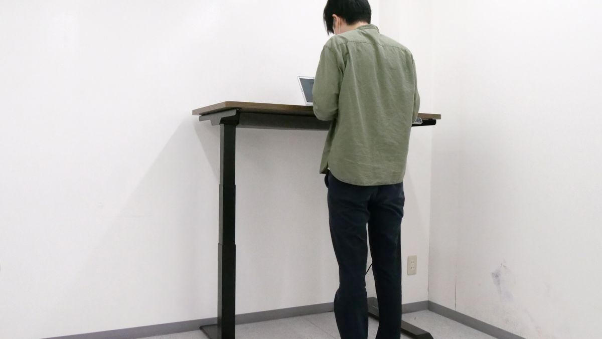 同じく身長約175cmの編集部員が立った状態で使ってみたところ、「120cm」ほどの高さだとデスクに肘も置けてPC作業が楽だと感じました。「E7 Click」であればボタンを押すだけで自由自在に高さを設定できるため、どんな姿勢でも最適な高さのデスクで作業できます。
