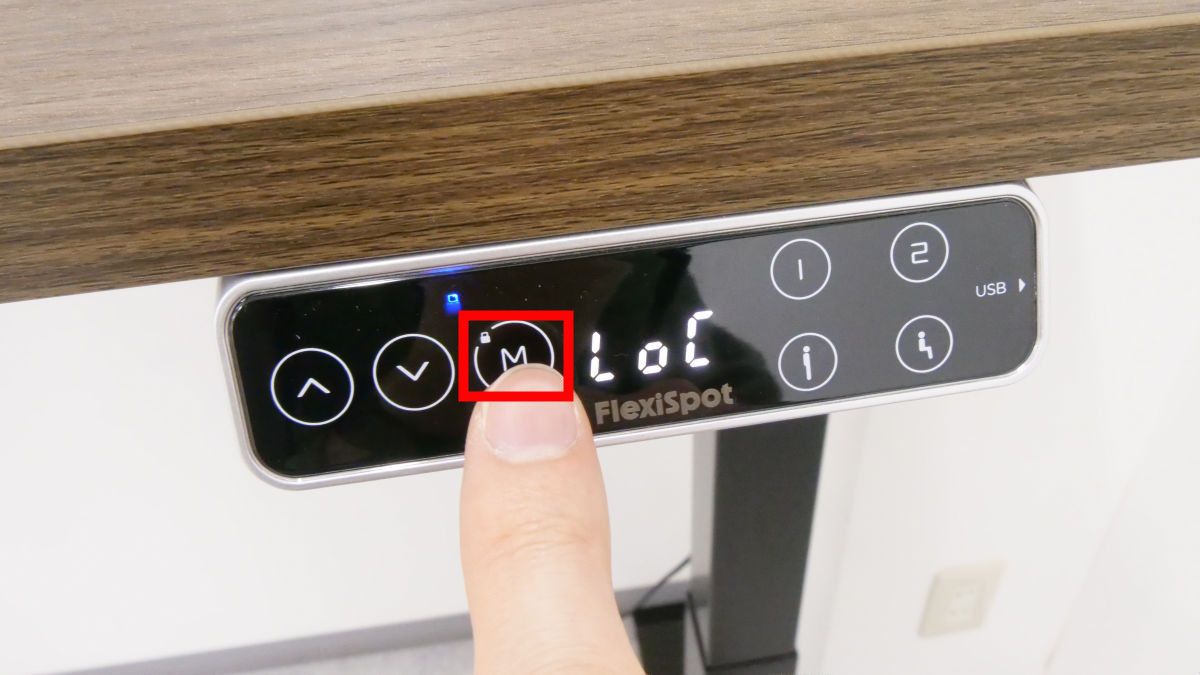 「M」と書かれているのは「メモリー/ロックボタン」で、このボタンを5秒間長押しすると液晶パネルに「LoC」と表示され、デスクの高さがロックされます。ロック状態になると、「上/下ボタン」や「位置記憶ボタン」を押しても高さが変わりません。解除するには再び「メモリー/ロックボタン」を5秒間長押しすればOKです。