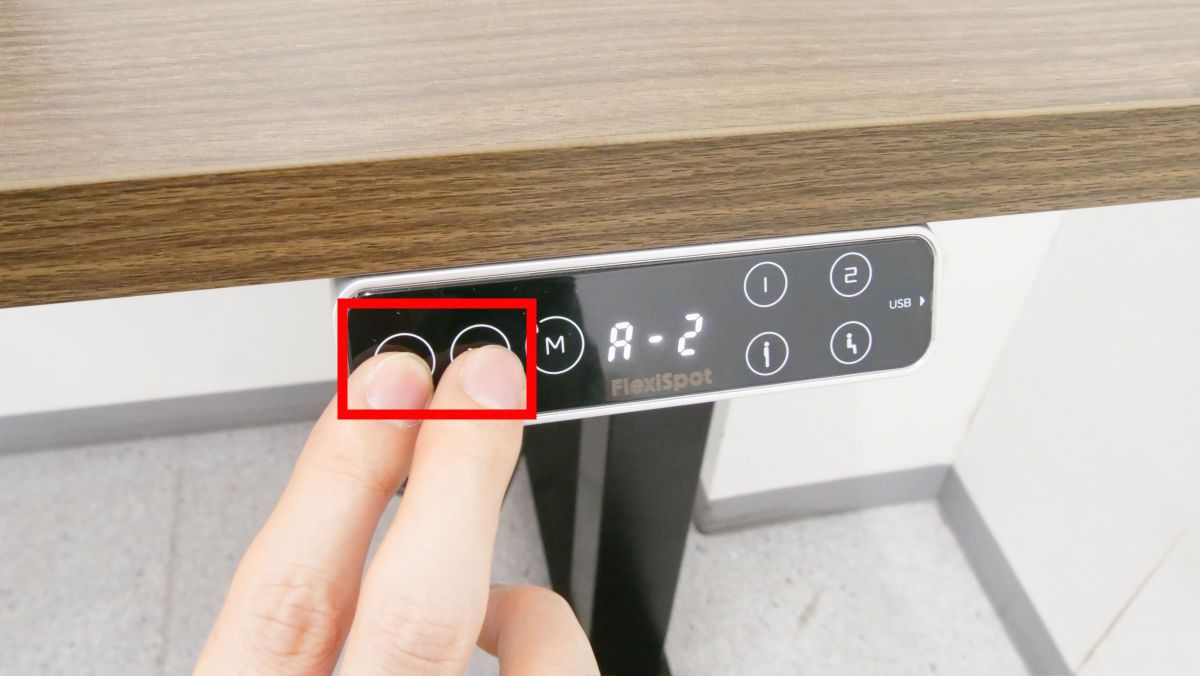 また、「メモリー/ロックボタン」を使用して、現在の高さを「位置記憶ボタン1」「位置記憶ボタン2」「立ち位置記憶ボタン」「座り位置記憶ボタン」のいずれかに割り当てることも可能です。まずはデスクを記憶させたい位置に移動させます。