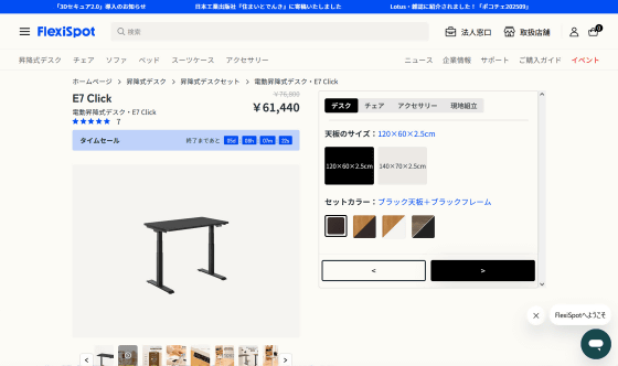 「E7 Click」はFlexiSpot公式ストアで購入可能。カラーは天板が「ブラック」または「メープル」の2種類、フレームが「ブラック」または「ホワイト」の2種類から選択でき、天板サイズが120cm×60cm×2.5cmのバージョンは税込7万6800円、天板サイズが140cm×70cm×2.5cmのバージョンは税込7万9800円。2026年4月20日(月)23時59分まではタイムセール実施中で20%オフとなっており、天板サイズが120cm×60cm×2.5cmのバージョンは税込6万1440円、天板サイズが140cm×70cm×2.5cmのバージョンは税込6万3840円となっていました。