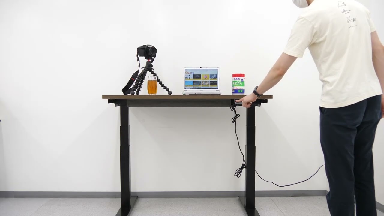 実際にノートPCやお茶の入ったグラス、三脚に取り付けたカメラなどをデスクの上に載せ、「E7 Click」を昇降させてみた様子は以下の動画で確認できます。
