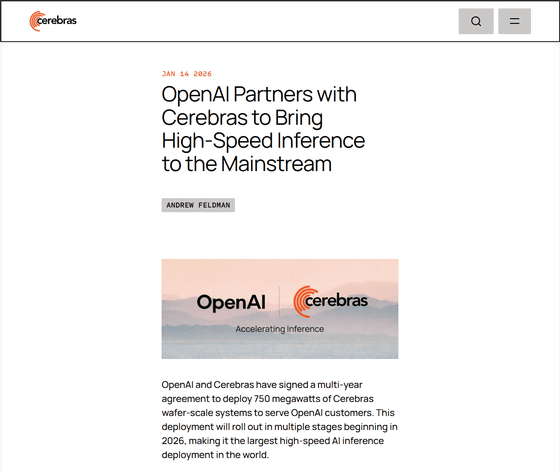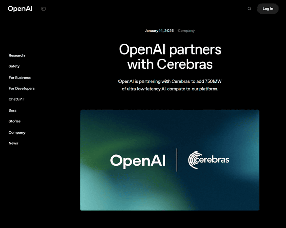 現地時間の2026年1月14日、OpenAIがCerebrasとの提携を発表しました。CerebrasはAIモデルからの長時間出力を高速化するため、専用のAIシステムを構築している企業です。
