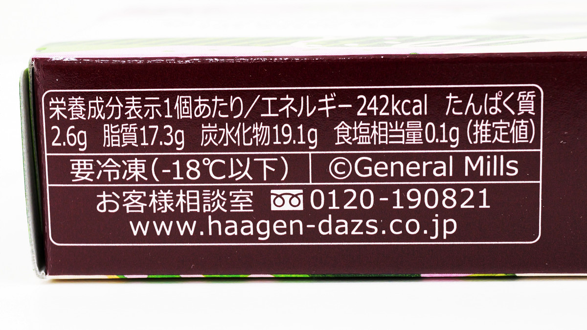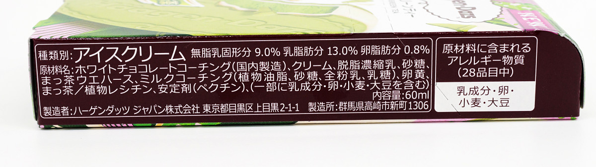 種類別はアイスクリームで、無脂乳固形分が9.0%、乳脂肪分が13.0%、卵脂肪分が0.8%含まれています。原材料にはホワイトチョコレートコーチング、クリーム、まっ茶ウエハース、まっ茶などが使われています。