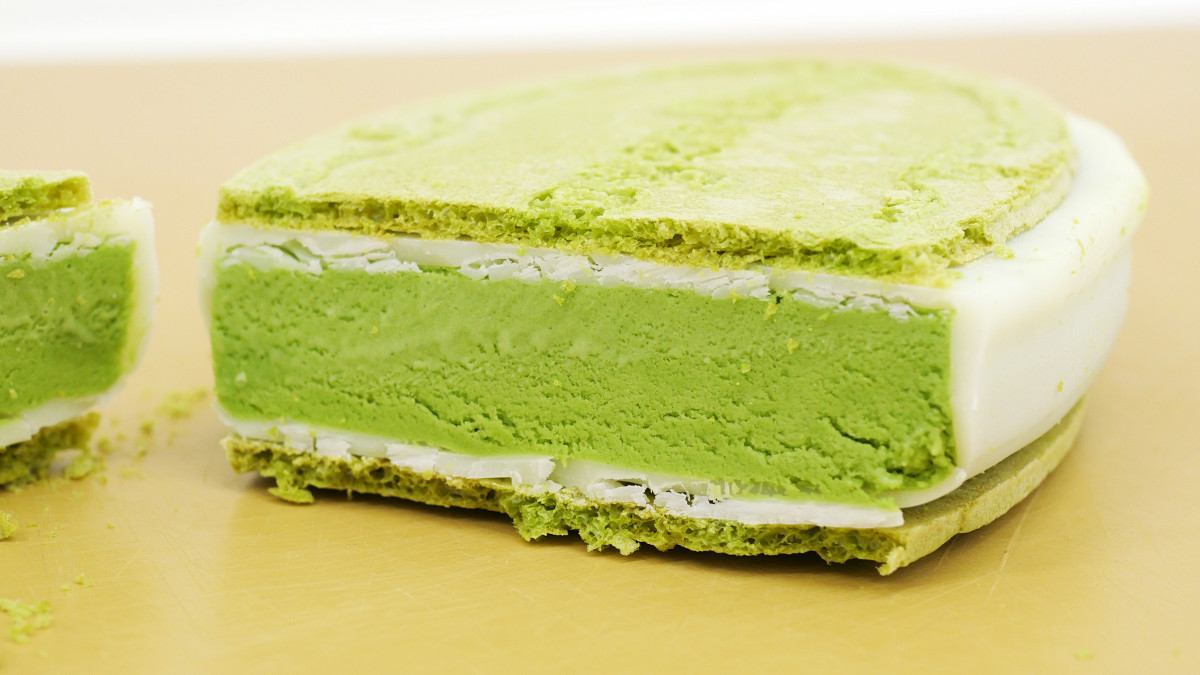 抹茶アイスクリームは白いホワイトチョコレートコーチングで覆われており、内部の抹茶アイスクリームが透けて淡い緑色になっています。