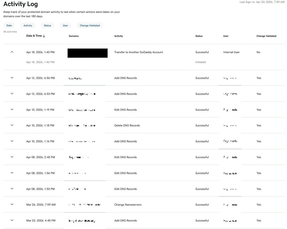 事件後、フラッグストリームが監査ログを確認すると「別のGoDaddyアカウントへの転送」と表記してあり、「内部ユーザーによって実行された」という記録がありました。また、「検証なし」で実行された操作であることも記録されており、外部からの不正アクセスではなく、サービス提供側の内部操作として処理された可能性がありました。