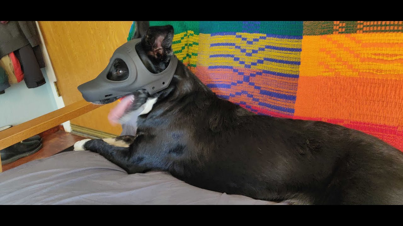 実際に飼い犬にマスクを取り付けるとこんな感じ。ダドリーさんによればマスクの品質はよく、満足のいく出来だったそうですが、犬は物の形状にとても敏感であるため、他の犬がマスクを付けた犬を非常に怖がってしまったとのこと。そのため、他の犬がたくさんいるドッグパークでの使用は控えざるを得ないとダドリーさんは述べました。