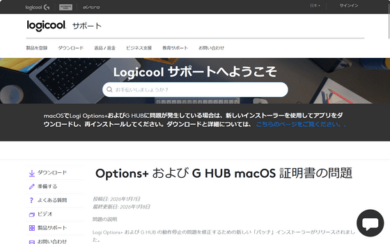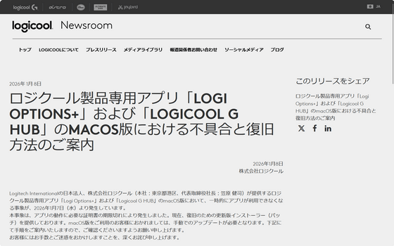 ロジクールによると、「Logi Options+」および「Logicool G HUB」のmacOS版において、一時的にアプリが利用できなくなる事象が2026年1月7日より発生しているとのこと。