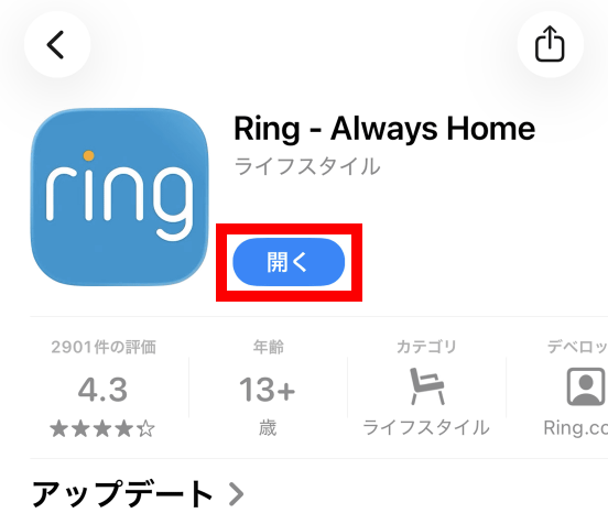 まずApp StoreでRingを検索してインストールし、インストールが完了したら「開く」をタップします。