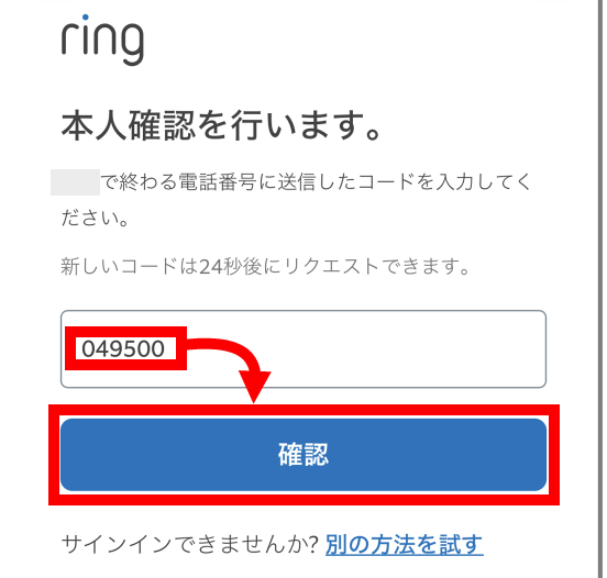 アカウントに登録してある電話番号に6桁の確認コードが届くので、確認コードを入力して「確認」をタップ。