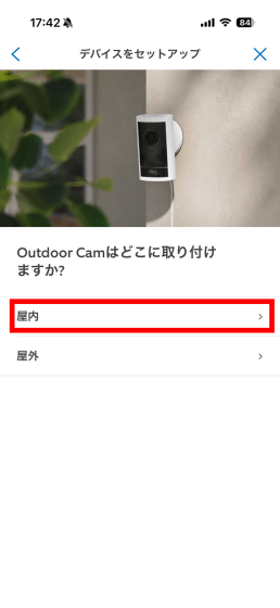 屋内か屋外のどちらに設置するか選択する画面が表示されます。今回は「屋内」をタップ。