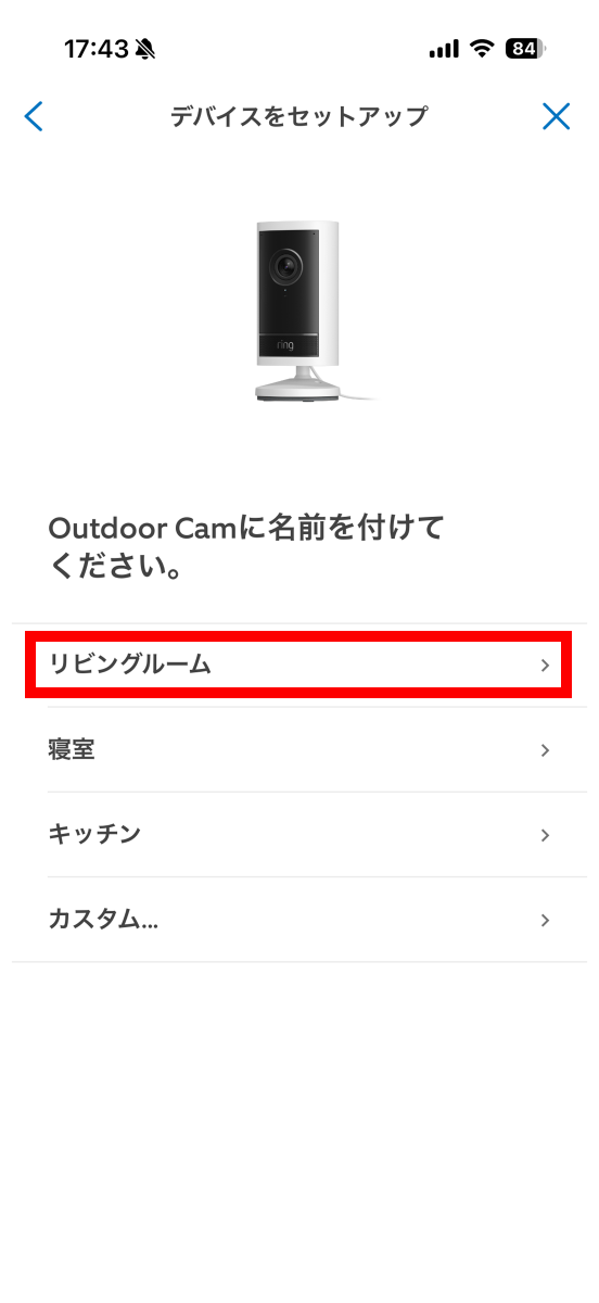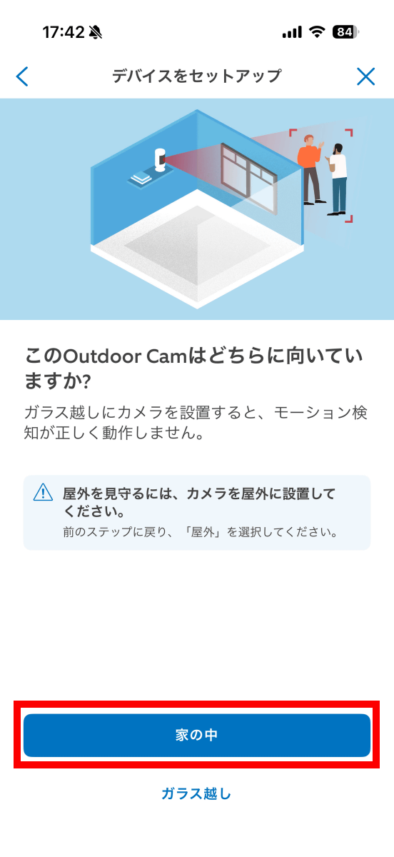 続いてカメラが家の中か外のどちらを向いているか選択する画面が表示されます。今回は「家の中」をタップ。