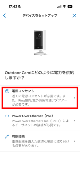 電力供給源の選択画面では「電源コンセント」をタップ。