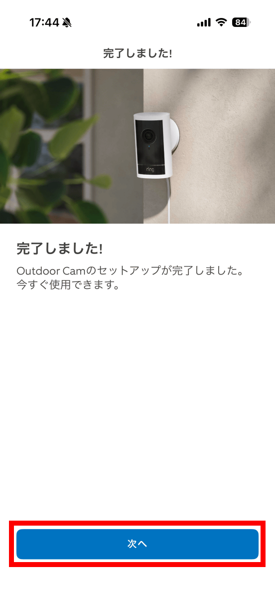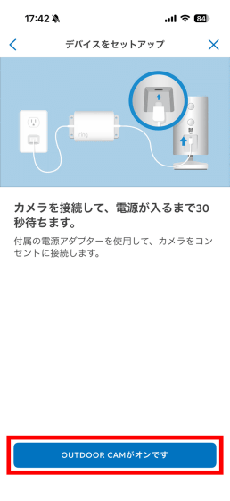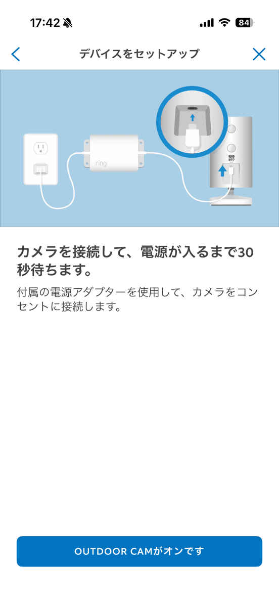 ここまで設定すると、Ring Outdoor Cam Proの電源を入れるように指示されます。