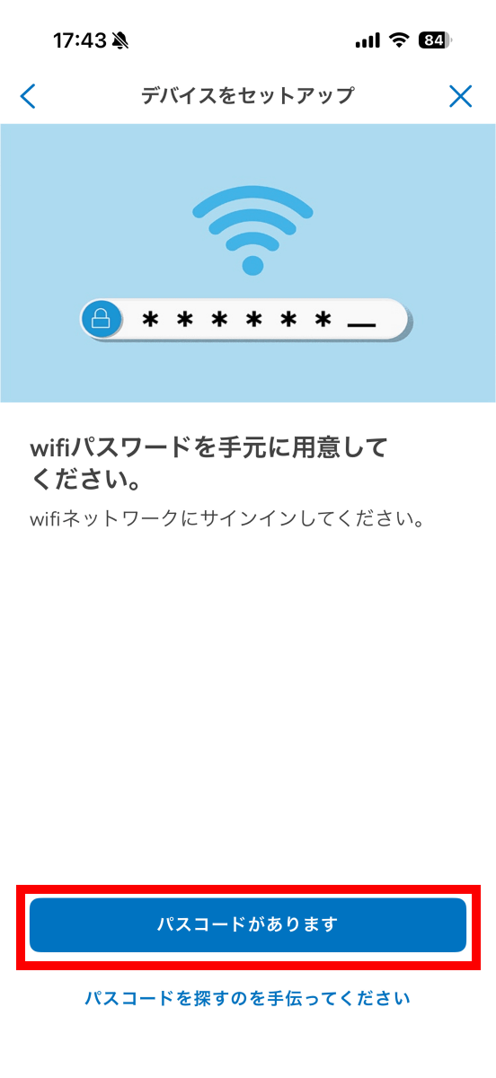 Ring Outdoor Cam Proはインターネットに接続して使うカメラなので、Wi-Fiへの接続設定が始まります。まずWi-Fiアクセスポイントのパスワードを手元に用意して「パスコードがあります」をタップ。
