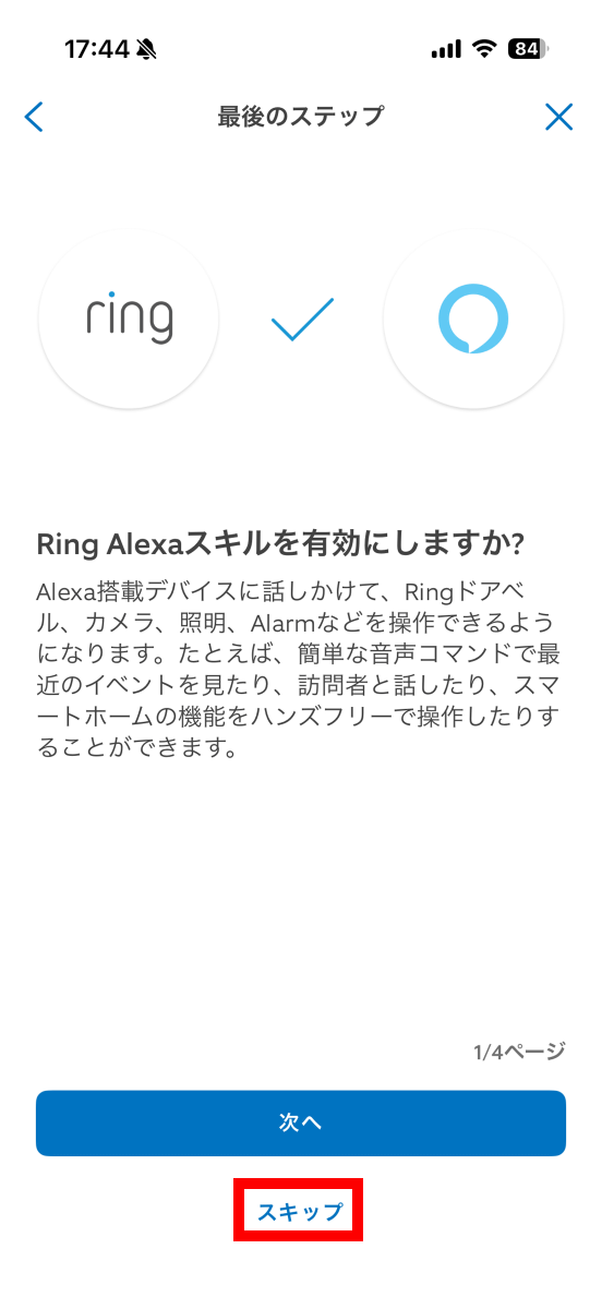 Alexaの説明画面が表示されます。Alexaは後から有効にできるので今回は「スキップ」をタップ。