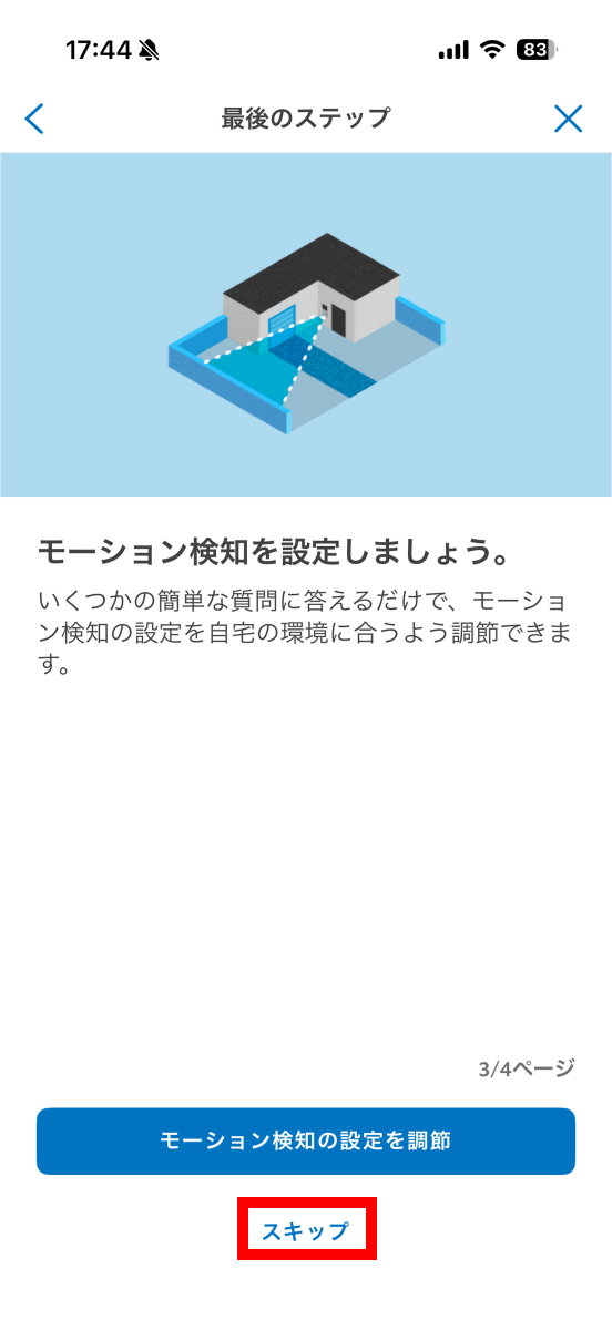 モーション検知機能も後からカスタムできるので「スキップ」をタップ。