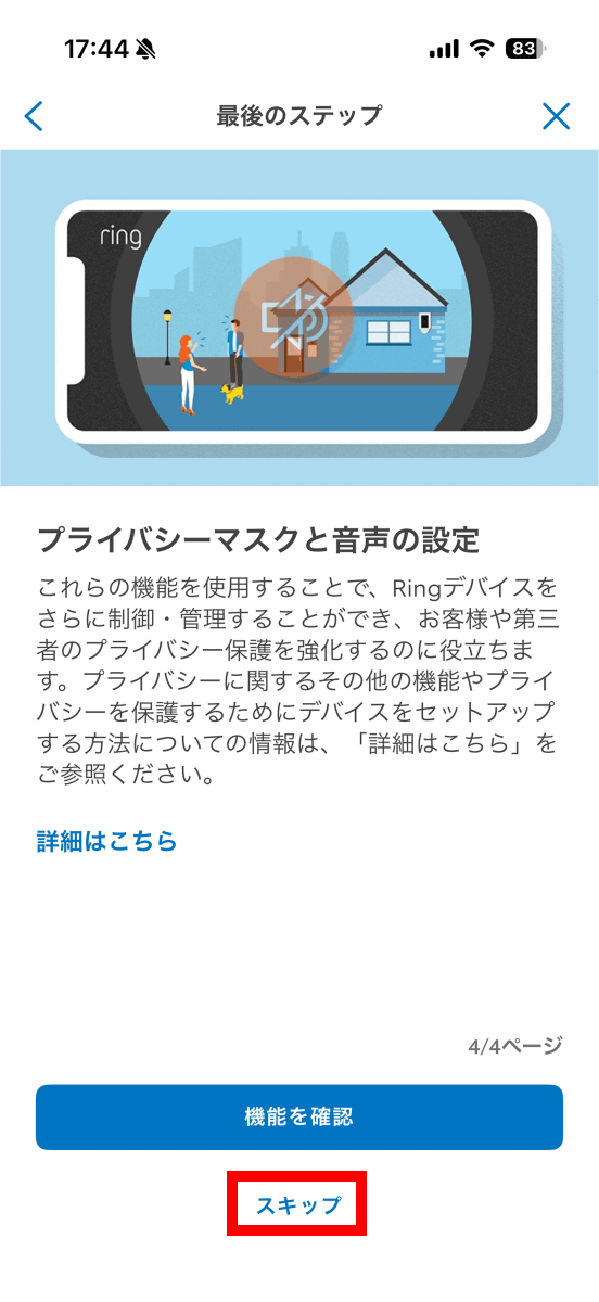 プライバシー機能も後から設定可能なので「スキップ」をタップ。