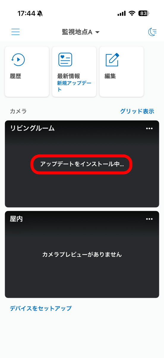 アップデートが完了するとRingのトップ画面にRing Outdoor Cam Proで撮影した映像のスナップショットが表示されます。スナップショットをタップするとカメラの個別ページを確認できます。