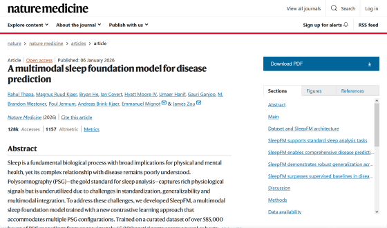 睡眠は心身の健康と密接に関わっていることが知られており、健康状態が悪化すると睡眠にも悪影響が及ぶことが多々あります。新たにスタンフォード大学医学部の研究チームが、1晩の睡眠から100以上の病気のリスクを予測するAIモデル「SleepFM」を開発したと報告しました。