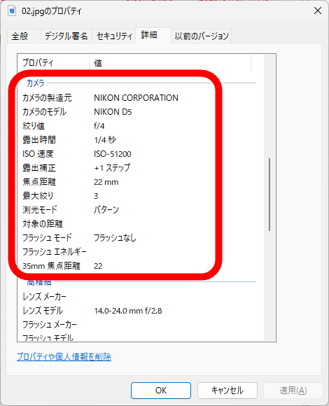 Exifデータのカメラ情報が以下。カメラはNikon D5を使用し、絞り値はF4、シャッタースピードは1/4秒、ISO感度は5万1200で撮影したことが分かります。