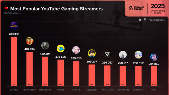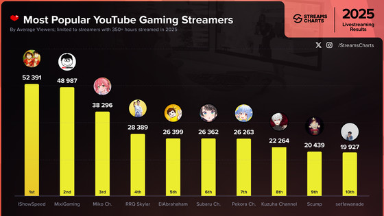 配信プラットフォームに関する分析を行うStreams Chartsが、YouTubeにおけるゲーム実況の2025年度人気ストリーマーランキングを発表しました。
