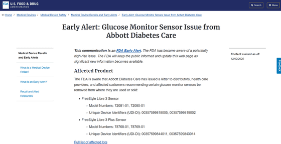 https://www.fda.gov/medical-devices/medical-device-recalls-and-early-alerts/early-alert-glucose-monitor-sensor-issue-abbott-diabetes-care
