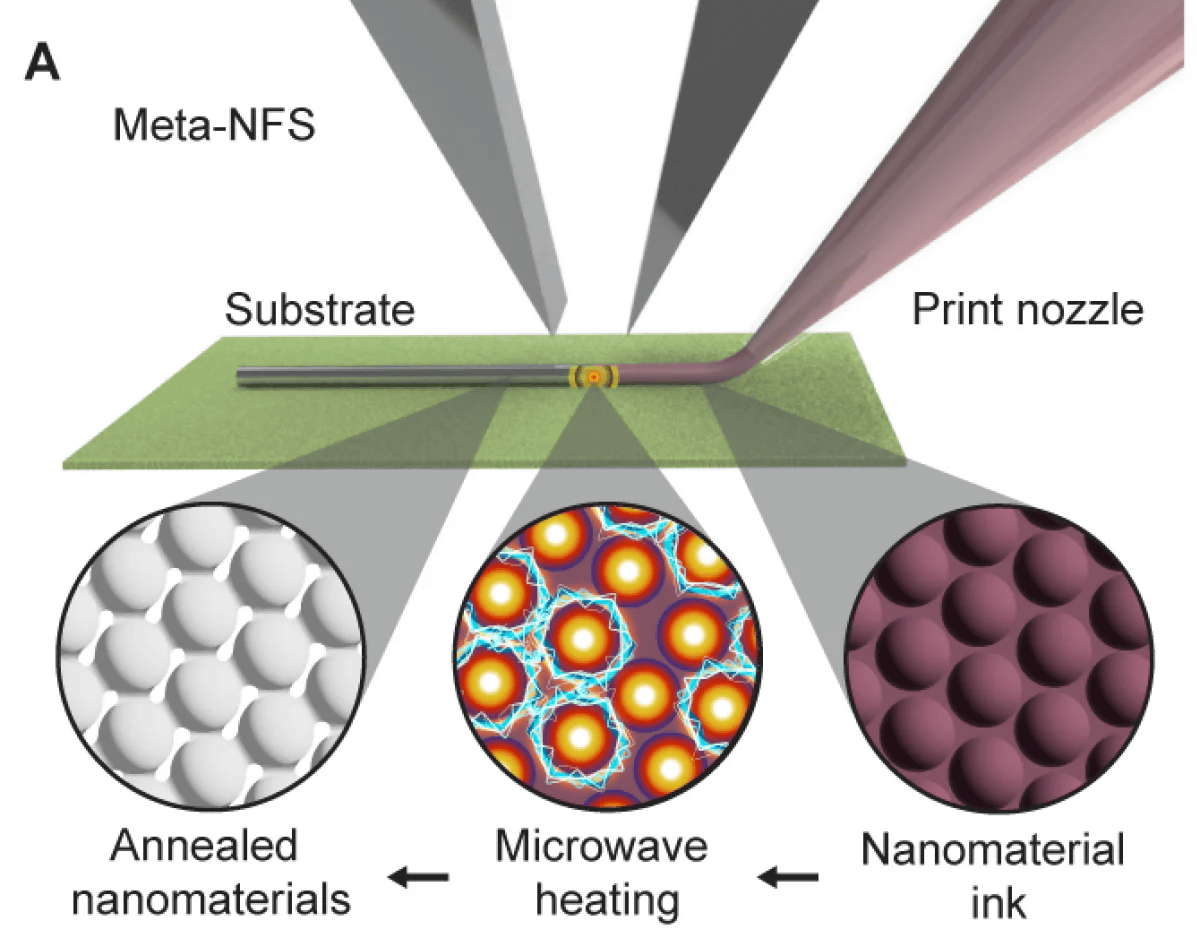 以下の図は「Print nozzle(3Dプリンターのノズル)」から押し出された材料が「Meta-NFS」で焼結されるプロセスを示したもの。Meta-NFSは積層した材料内部から加熱することで機能し、マイクロ波をリアルタイムで調整することで連続した3Dプリント過程におけるナノ粒子の結晶構造を変え、異なる電気的・機械的特性をプログラムすることもできるとのこと。