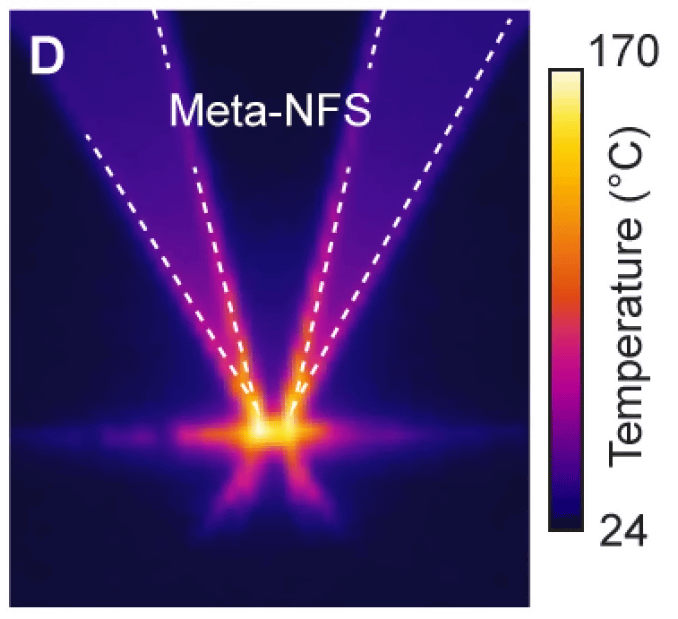 Meta-NFSによる温度変化を示した以下の画像を見ると、インク材料のみがピンポイントで加熱されており、下の基板にはほとんど影響していないことがわかります。