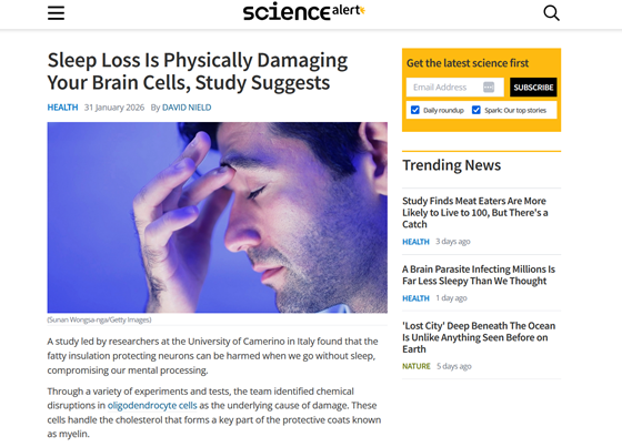 睡眠不足の日が続くと頭がぼんやりしたり、反応が遅れたりしやすくなります。こうした変化は気分や根性の問題ではなく、神経の信号を速く伝えるための髄鞘(ずいしょう)が傷ついている可能性があるのだとイタリアのカメリーノ大学を中心とする研究チームが報告しました。