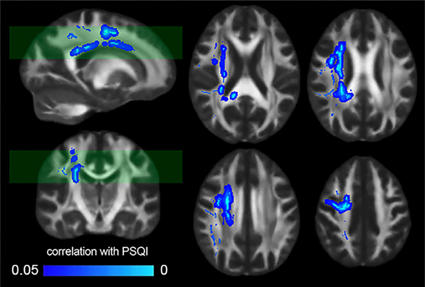 今回の研究では人の脳の画像データと動物実験を組み合わせて、睡眠不足と「白質」という髄鞘が多い領域の関係が分析されました。まず185人分の脳MRIデータでは、睡眠の質を自己申告で評価する指標「Pittsburgh Sleep Quality Index(PSQI)」のスコアが悪いほど、白質の指標が低い傾向が広い範囲で見られたとのこと。