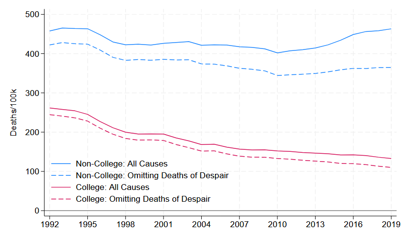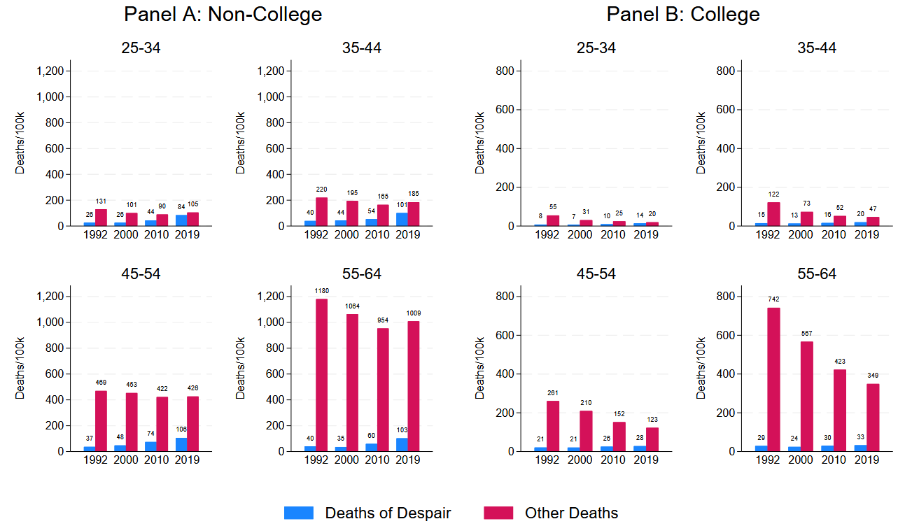 死亡率格差の説明でよく取り上げられるのが薬物の過剰摂取やアルコール関連の疾患・自死などの「絶望死」です。しかし、年齢別の内訳を見ると非大学卒業者では絶望死以外の死亡も大きく、格差が単一の死因だけで成立しているわけではないことが分かります。