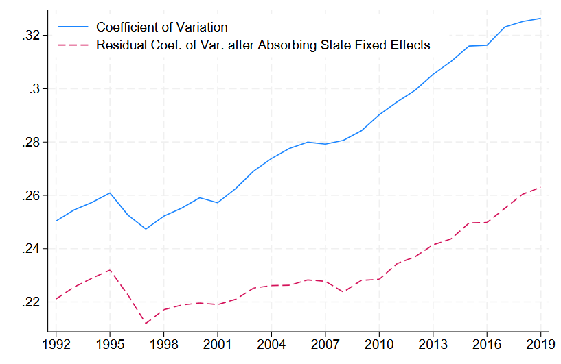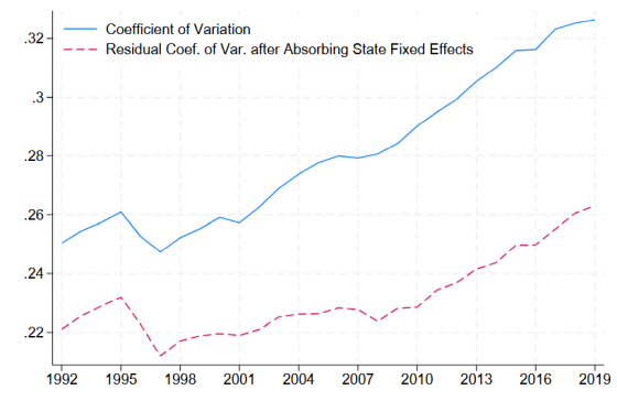研究チームが重視したのは同じ非大学卒業者の中でも「住む場所によって改善の度合いが異なる」点です。郡ごとの死亡率のばらつきは時間とともに拡大しており、平均値の差だけでなく地域差そのものが大きくなってきたことが示されています。