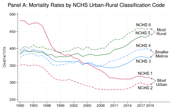 この地理の差は都市部と農村部の違いとのことで、都市側では死亡率の改善が進む一方で農村側では改善が鈍く、農村部が不利になる形になっています。学歴差が広がるだけでなく、地域要因が重なって格差が固定化していく構図が示唆されます。
