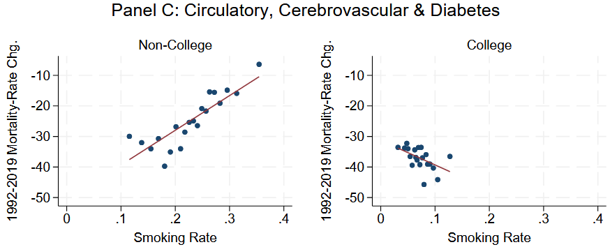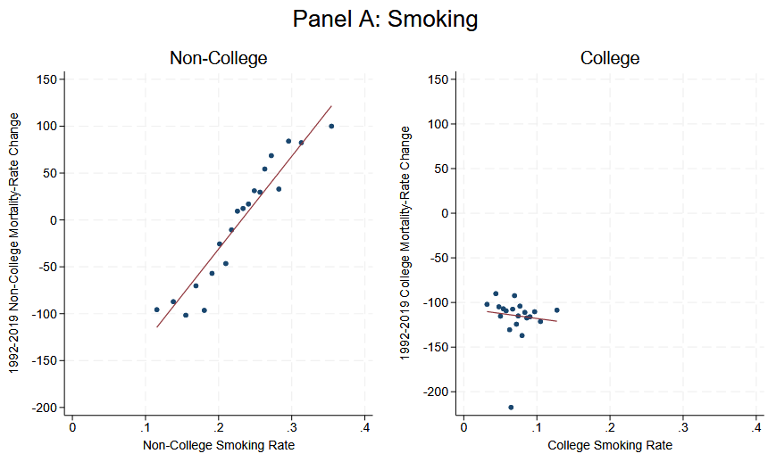 さらに、喫煙率が高い地域ほどその後の死亡率が悪化しやすい(改善しにくい)傾向が、非大学卒業者ではより強く表れるとのこと。大学卒業者側でも喫煙は健康を脅かすリスクになりますが、地理的な変化と結び付く度合いは相対的に弱く、喫煙が「非大学卒業者側の地域差の拡大」と重なっている可能性が示唆されます。