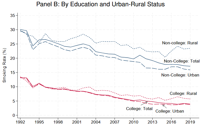研究チームはこうした地理的な分岐を生む要因として複数の候補を比較した上で「喫煙率の地域差は死亡率の地域差がどう広がったかと強く結び付いていた」と述べています。喫煙率の推移を学歴と都市・農村で分けると、大学卒業者では都市・農村とも低下が進む一方で非大学卒業者では農村部の喫煙率が高止まりしやすく、都市と農村の開きが残りやすい傾向が示されています。