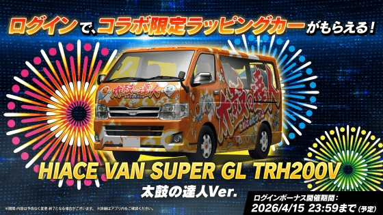 さらに、ログインボーナスとしてHIACE VAN SUPER GL TRH200V 太鼓の達人Ver.も入手できます。
