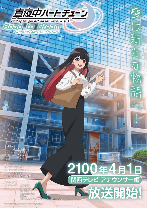 テレビアニメ『真夜中ハートチューン』で雨月しのぶを主人公としたアナザーストーリー「Road to Dream―SHINOBU ANOTHER STORY― 関西テレビ アナウンサー編」のビジュアルが公開されています。主演は雨月しのぶ、ナレーションは日芽川寧々、安藤檸檬/鮫島が友情出演します。また、OP主題歌は井ノ華六花、ED主題歌はVTuberのすめらぎイコンが担当するとのこと。