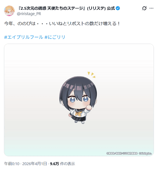 漫画・テレビアニメ「2.5次元の誘惑」を原作とするスマートフォン向けゲーム「2.5次元の誘惑 天使たちのステージ」の公式Xアカウントで、乃愛こと「ののぴ」がいいねとリポストの数だけ増えるとのこと。