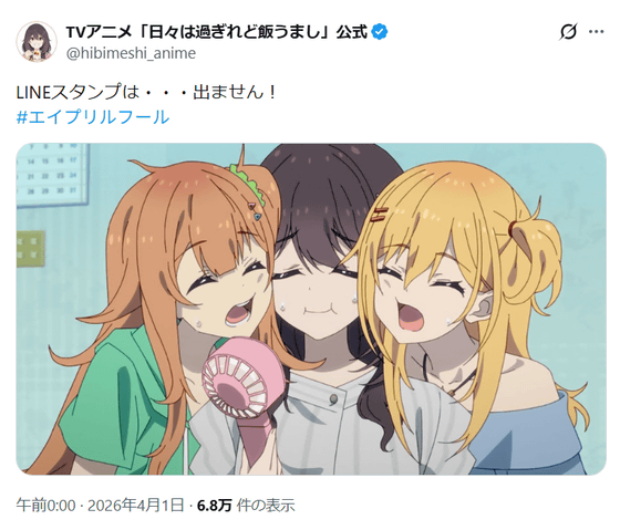 テレビアニメ『日々は過ぎれど飯うまし』の公式Xアカウントが「LINEスタンプは・・・出ません!」というポスト。「#エイプリルフール」というハッシュタグがついていることから、逆にLINEスタンプが出る可能性は高そうです。