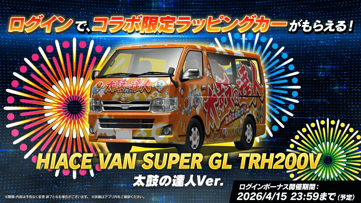 さらに、ログインボーナスとしてHIACE VAN SUPER GL TRH200V 太鼓の達人Ver.も入手できます。