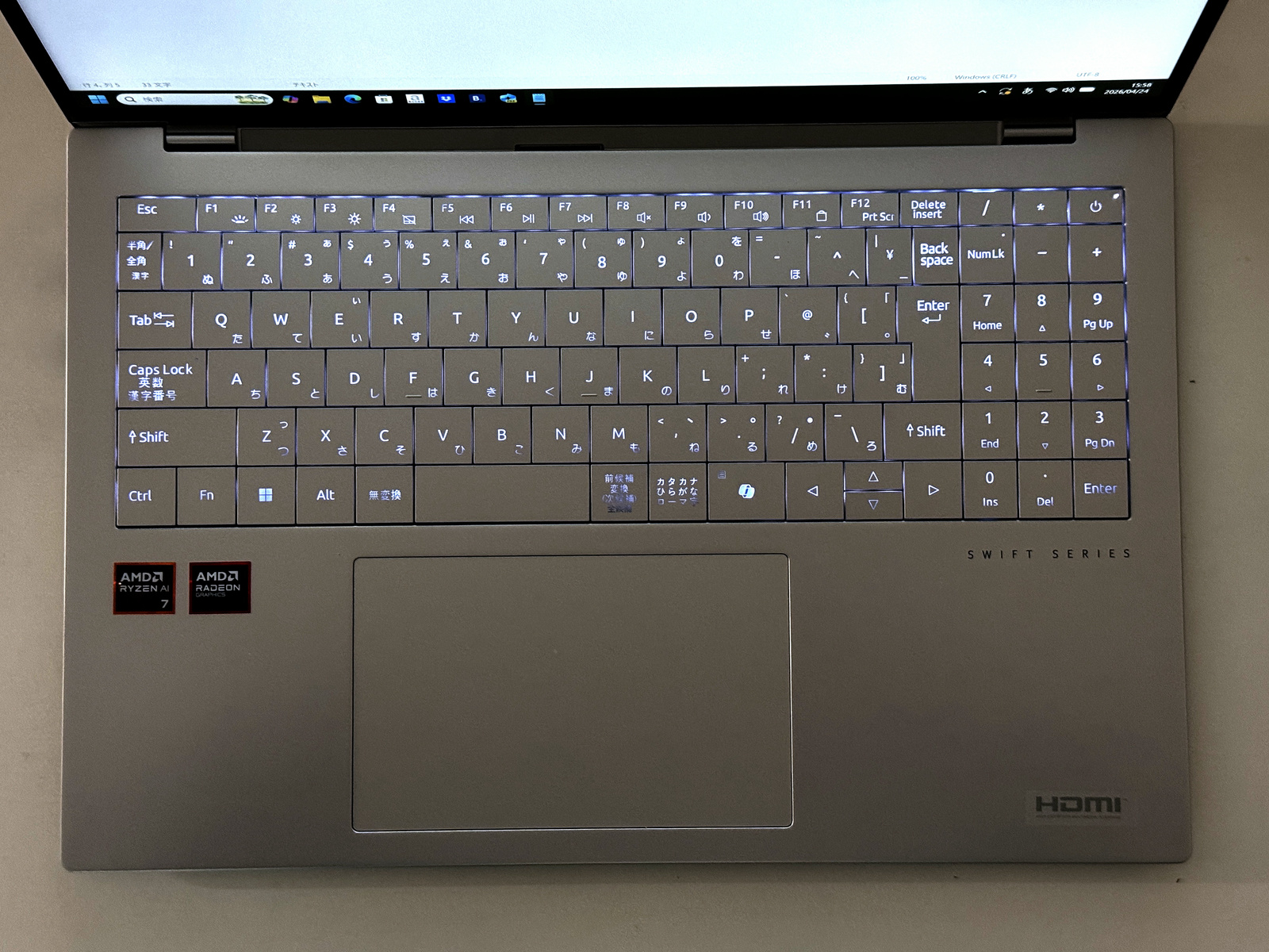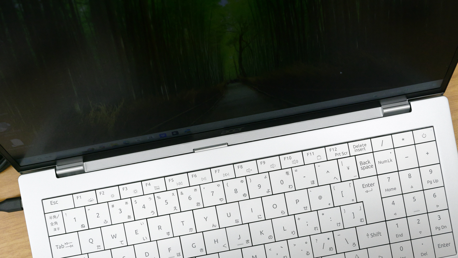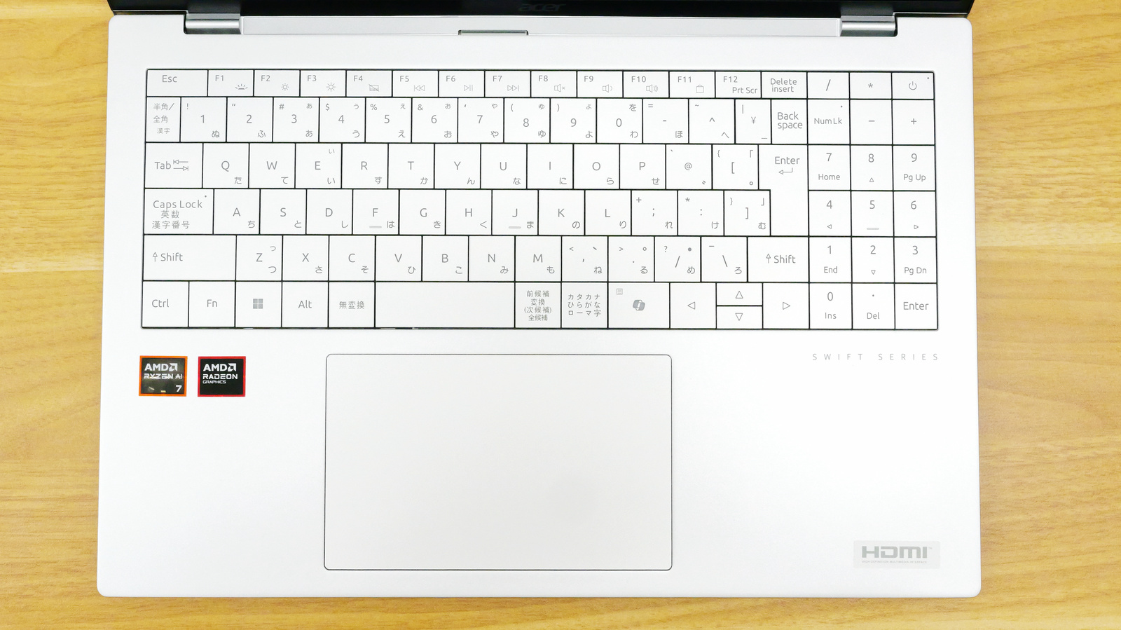 キーボードは日本語配列で、右にテンキーが配置されています。また、Ctrlキーの右側はCopilotキーとなっています。テンキーを納めた分、Enterキーや右Shiftキー、スペースキーなどがやや幅狭くなっている印象。