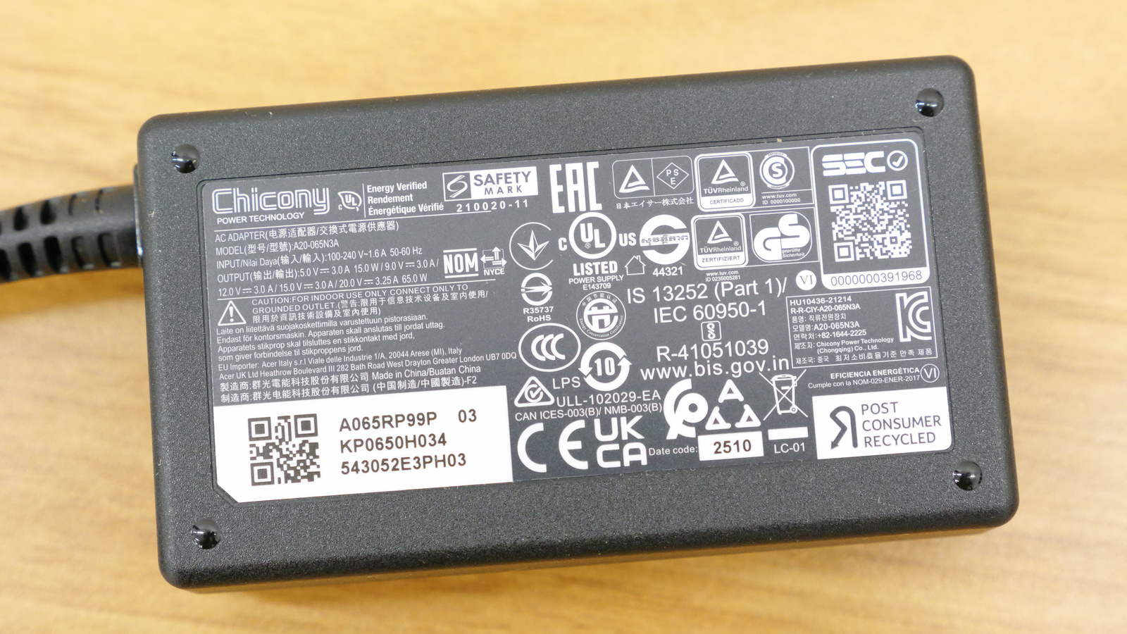ACアダプターは20V×3.25A=最大65W出力でした。