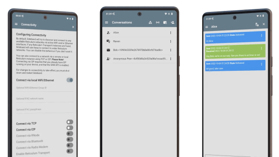 Reticulum Network Stackに対応したアプリも複数公開されています。例えば、Reticulum Network Stackの開発者であるMark Qvist氏が開発した「Sideband」ではテキストメッセージのやり取りや音声通話が可能です。対応OSはAndroid、Windows、macOS、Linuxです。