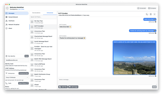 Liam Cottle氏が開発した「Reticulum MeshChat」ではテキストメッセージや音声通話、ファイル送受信を分かりやすいGUI上で実行できます。対応OSはWindows、macOS、Linuxです。