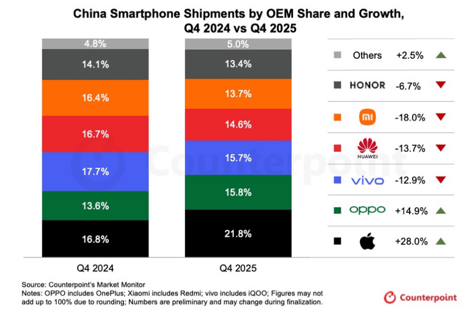 China Smartphone Shipments Slip 1.6% YoY in Q4 2025; Apple Leads With 22% Share