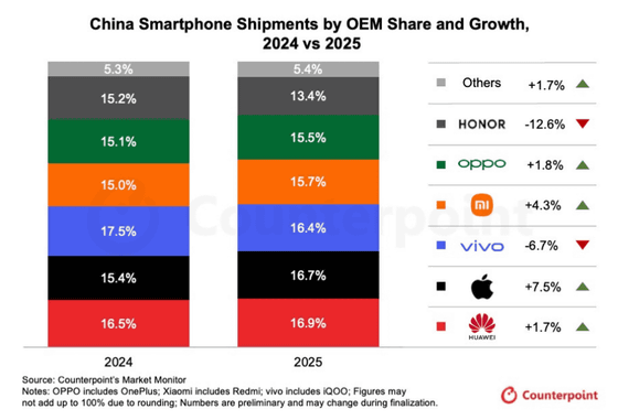 第4四半期のスマートフォン出荷台数シェアを見ると、iPhone 17シリーズが好調なAppleが21.8%で首位となり、前年同期比28.0%増という突出した成長を遂げています。一方で出荷台数の成長率を見ると、Xiaomiが18.0%減、Huaweiが13.7%減、vivoが12.9%減と、多くの主要メーカーがメモリコストの高騰による影響で大幅な出荷減少に見舞われました。
