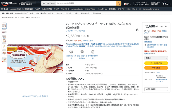 クリスピーサンド贅沢いちごミルクは2026年1月20日発売で、希望小売価格は税込351円です。記事作成時点ではAmazon.co.jpでも注文できるようになっており、6個セットが税込2680円となっていました。