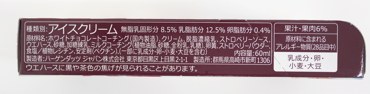 種類別はアイスクリームで、原材料にはホワイトチョコレートコーチングやクリーム、ストロベリーソースなどが含まれています。