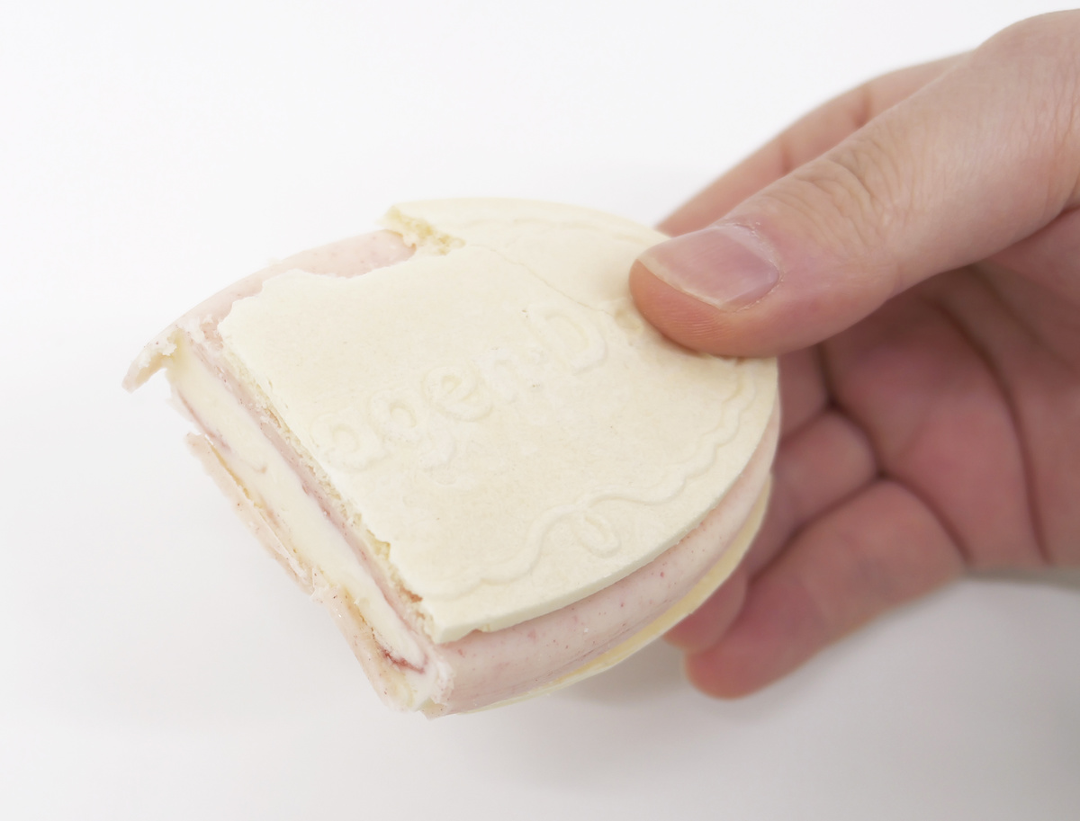 カットして断面を見てみると、ピンク色の部分はパリッとしたいちごコーティングで、中のアイスは白いミルクアイスクリームです。アイスの中央付近には赤いストロベリーソースも発見。